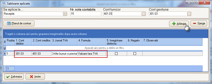 Se poate adauga un sablon pentru o nota contabila: se va preciza unde se aplica – se selecteaza din lista propusa – receptie, transferuri, consumuri, plati, incasari samd, se introduce un numar al notei respective, si se precizeaza tipurile de conturi corespunzatoare. Ex: in campul se aplica la completam receptie, caz in care va trebui sa precizam contul furnizor (401*) si contul de gestiune (301*) in care intra.