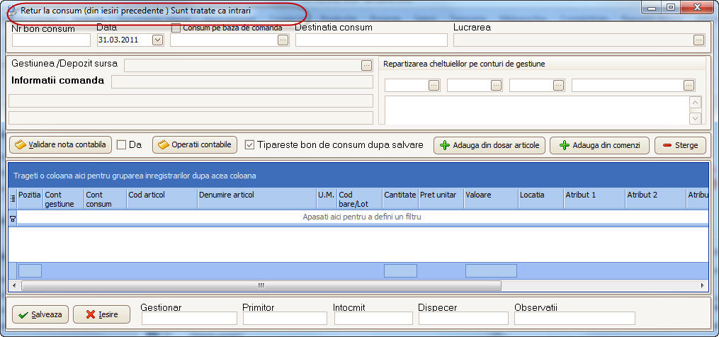 Retur din alte iesiri – se refera la situatiile operate pe “retur la consum (din iesiri precedente neprinse in baza de date curenta)”. Aceasta pagina arata la fel ca un bon de consum normal si ajuta in situatia in care baza de date actuala nu cuprinde si consumurile din anul trecut, dar se doreste a se face un storno la unele consumuri efectuate anul trecut. Se vor opera aceste “Retururi la comanda (din iesiri precedente)” care vor fi tratate ca intrari.