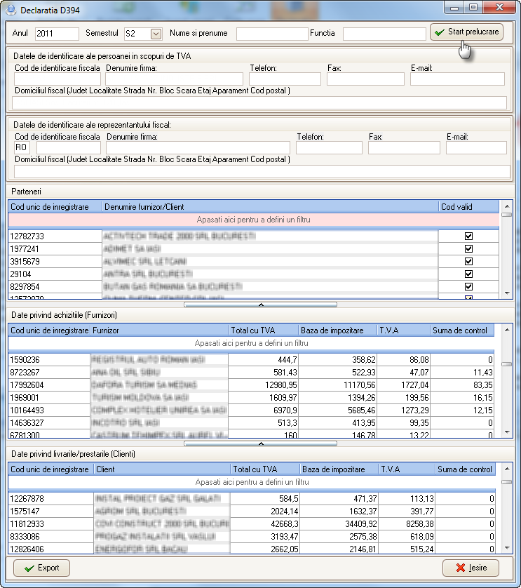 Fereastra prezinta in partea de sus campuri editabile cu privire la semestrul de lucru, nume si prenume, functie. De asemenea, sunt generate automat informatiile introduse cu privire la firma: cod de identificare fiscala, denumire firma, domiciliu fiscal. Se apasa butonul Start prelucrare, care va genera 3 grupe: partenerii, datele privind achizitiile si datele privind livrarile/serviciile.