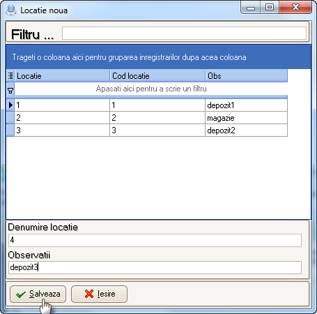 Macheta pentru locatie noua contine campul denumire locatie, observatii si filtru.