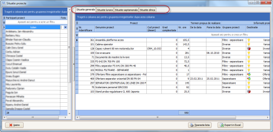 Partea de sus a ferestrei ofera posibilitatea de filtrare dupa denumire proiect, precum si afisare dupa toti participantii sau numai dupa unul din ei, ales din lista propusa.