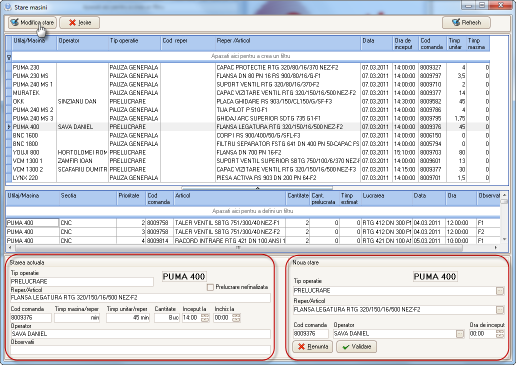 In partea de sus a ferestrei exista posibilitatea de a modifica starea, care va deschide o fereastra in care se pot schimba anumite informatii pentru o masina, de la starea actuala la noua stare (tip operatie, reper, cod comanda, timp masina/reper, timp unitar/reper, cantitate, ora de inceput, ora de inchis, operator si observatii). In momentul validarii se modifica automat si starea masinii respective.