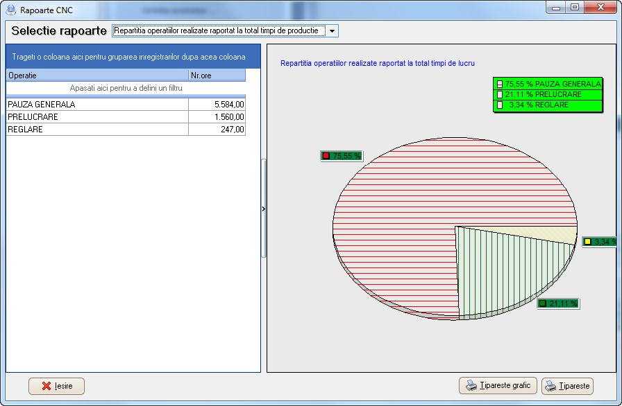 Prezinta, in functie de datele stabilite (de la – pana la), si timpii inactivi, pe langa cei de prelucrare si reglare.