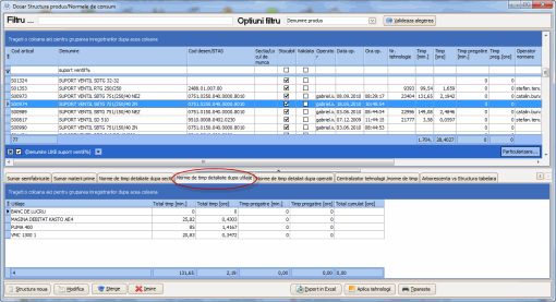 Norme de timp detaliate dupa utilaje – sunt insumate detaliile legate de timpii de lucru pe fiecare utilaj si contine in tabel: utilajul (ex: banc de lucru, strung), total timp (min., ore), timp pregatire (min, ore), total cumulat (ore).